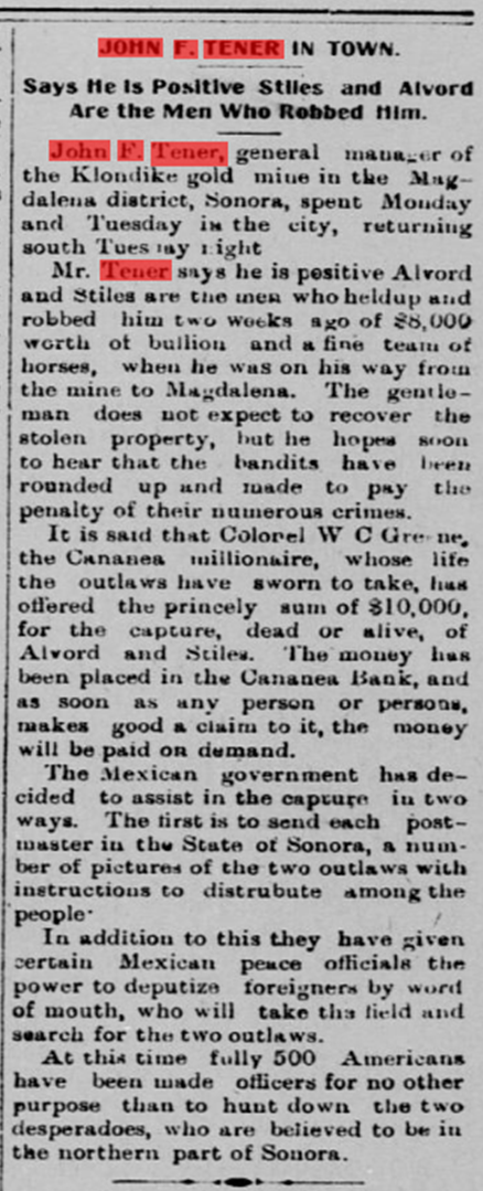 The 13 February 1904 edition of the Border Vidette carried a full descriptive article of the interaction between John F. Tener, Mr. Morris and the two outlaws - Bert Alvord and Billy Stiles: